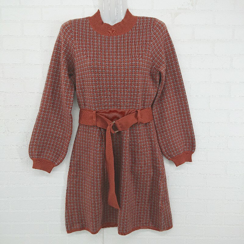 ◇ ◎ REDYAZEL レディアゼル ベルト付 ガンクラブ 長袖 膝丈 ニット ワンピース サイズF テラコッタ グレー レディース E 【中古】
