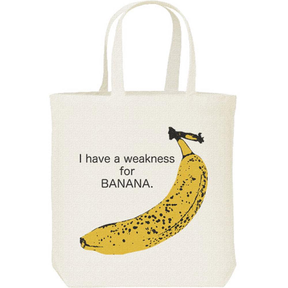フルーツ柄の中で人気の柄です! 食べごろシュガースポット(スイートスポット)が出ているバナナです。<ロゴ部分> I have a weakness for BANANA. バナナには目がない(大好き)。