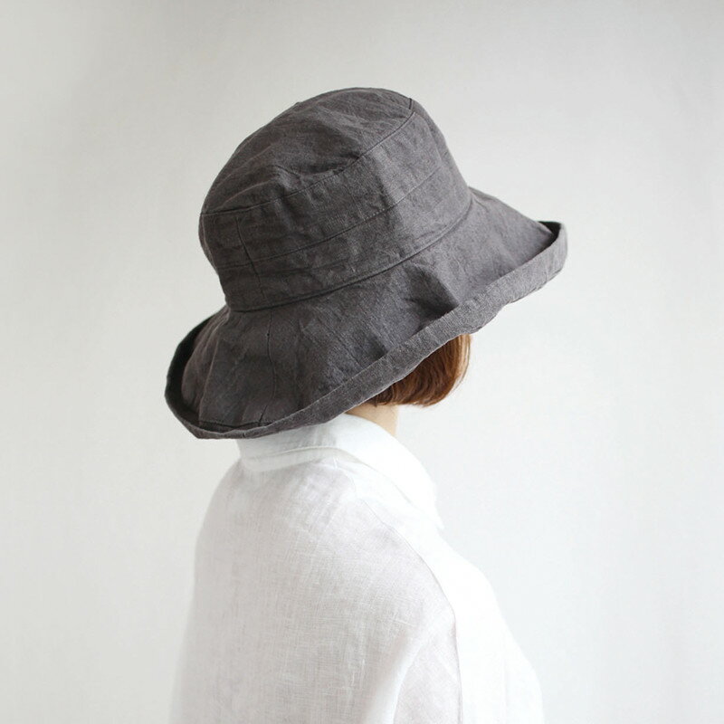 SIZE:ブリム12cm、頭周り60cm リネン100% リトアニア製 1.リネン素材の帽子は、通年紫外線対策に大活躍 首の後ろまで隠れる大きめのつばが、強い日差しからお肌を守ります。 汗の吸収がよく、また通気性もよく乾きやすいので、かぶった時の感触がさわやか。 2.サイズ調節紐付き ハットの内側に調節紐がついていて、 少しきつめに 結んでおけば、少々の風でも飛ばされにくくなります。 3.コンパクトに収納 コンパクトに折り畳めるからお出掛けにとても便利。 やや型崩れしても大丈夫。少し整えれば形状は元に戻ります。 4.つばの形が変えられる スタイルに合わせてつばの形をアレンジできます。 5.自宅で洗濯出来る ネットに入れて簡単に自宅でお洗濯ができます。 多少の汚れも安心。 ●色について オンラインの画面表示の色は、ご利用の環境により実際の色と多少異なる場合がございます。 また、天然素材のため、多少の色の違いが生じます。 ●サイズについて 表記のサイズは出来上がりサイズになりますが、 また、表記サイズの前後5%の差は許容範囲としてご了承願います。 ※お取扱いについては、品質表示タグをご確認の上ご使用ください。 リネン特有の多少の織りキズ、ネップ、節、繊維片などが含まれる場合もございますが、天然素材の自然な風合いとしてあらかじめご了承願います。