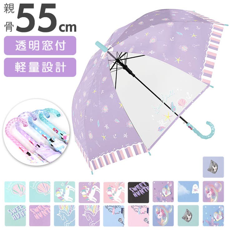 ・雨の日もめいっぱいオシャレして、テンションアップ!女の子向けの長傘。(親骨55cmタイプ)・傘生地のひとコマにはビニール窓付き!薄暗い雨の日の登校時や夕方の下校時でも前がはっきり見通せて、パパママも安心。・親骨には軽くて折れにくく、さびにくいグラスファイバー素材を採用。・片手にサブバッグを持っている時でも、ワンタッチでパッと傘が広がるジャンプ式。・面ファスナー式の留めバンドで、傘生地をサッとひとまとめ!角丸加工を施しており、お子さまの指先をキズから守ってくれる。・さらにバンド裏には、お友だちの傘との取り違えが防げるネームタグ付き。・手元ハンドルはラメ入りのグラレーションカラーでとってもキュート♪(※カラーによりハンドルの色味とデザインが異なります。)【素材】[傘生地の組成]ポリエステル100%(一部ポリエチレン樹脂使用)[親骨]グラスファイバー【生産国】中国【サイズ】[親骨の長さ]約55cm/[直径]約90cm/[全長]約76cm※サイズは当店計測の実寸サイズです。実際の商品ならびにメーカー表記サイズとは多少の誤差が生じる場合がございます。あらかじめご了承ください。【重量】約325g【注意点】※ステッキがわりに使用しないでください。※手元、または傘の先端がこわれたまま使用しないでください。※骨の先端がこわれたまま使用しないでください。※振り回したり投げたりしないでください。※強風時や台風の時は破損する恐れがありますので、使用をお控えください。※傘骨の構造部に手を触れないでください。※ご使用後は水気を切って、陰干しして収納してください。色が移ることがあります。※手元部材等が加水分解や経年劣化により破裂する原因になりますので車中などの高温多湿な環境に一定期間放置しないで下さい。※降雨量が20mm以上の場合、ある程度使用されますと漏水の恐れがありますのでご注意下さい。※製品には構造上、骨同士が狭くなっている部分があり、骨に挟まれたり怪我をする恐れがありますので、手や指を入れないでください。※製品には尖った部分があります。常に周囲の安全を十分に確認の上使用してください。※傘の開閉時及びシャフトの伸縮時には、顔や身体から離して使用してください。※グラスファイバー骨部分が破損した際はトゲが刺さる場合がありますので、破損部分を直接触らないようにしてください。※お子様には保護者の方からご注意下さい。※カメラやモニターの性質により、画像と実物の色の違いがある場合がございますのでご理解願います。【キーワード】子供用 ジャンプ ワンタッチ 55 55センチ ジャンプ傘 おしゃれ オシャレ かわいい 可愛い ゆめかわ 透明傘 透明窓 透明コマ 小学生 通学 登校 こども傘 子ども傘 雨具 女児 ガールズ ファッション雑貨 キッズファッション返品・交換について購入後の交換は受け付けておりません。予めご了承ください。返品を希望される場合は購入履歴一覧の「ショップへの問い合わせ」よりお問い合わせください。=========================複数配送先指定について1件の注文に対して、異なる住所への配送は対応出来かねます。恐れ入りますが、異なる住所へ配送をご希望の場合、配送先毎に分けて注文いただきますようお願い申し上げます。【小物WOMEN】傘 シャイニーマリンMINT シャイニーマリンPURPLE シャイニーマリンSAX ペガサスインザナイトPURPLE ペガサスインザナイトSAX ドーナツラブベアPURPLE ドーナツラブベアMINT ドーナツラブベアBLACK スイートユニコーンPINK スイートユニコーンPURPLE スイートユニコーンMINT ラブマイノリティPINK ラブマイノリティPURPLE ラブマイノリティSAX バブルユニコーン/パープル バブルユニコーン/サックス キャット&ミー/ラベンダー キャット&ミー/ミント マーメイドシェル/パープル マーメイドシェル/サックス ミルクおばけ/パープル ミルクおばけ/サックス シアーデイズ/ミント シアーデイズ/パープル カラフルマリン/パープル カラフルマリン/サックス