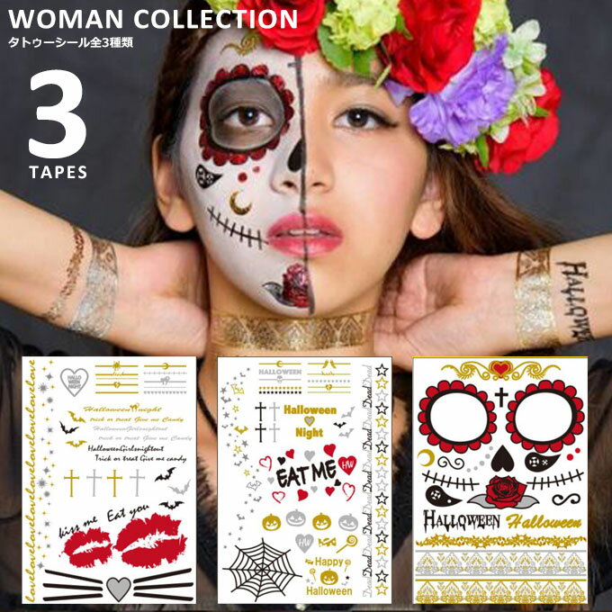 \15%OFF!クーポン/ ハロウィン タトゥーシール 全3種類 【メール便送料無料】 かわいい メイク 本格的 タトゥー ボディジュエリー 骸骨 スカル うさぎ バニー かぼちゃ クロス ハート 赤 ゴールド シルバー キラキラ コスプレ ネイル 秋 夏 花嫁 HAL