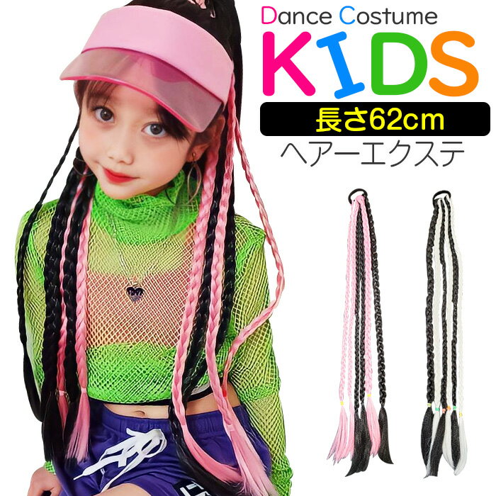 三つ編みエクステ 編み込み カラーエクステ 1束6本セット ゴムタイプ 簡単 便利 女の子 子供 キッズ ガールズ ウイッグ ドレッド ブラック・ピンク ブラック・ホワイト 長さ62cm 重さ77g つけ毛 派手 ヘアーエクステ ツインテール ヒップホップ 七五三