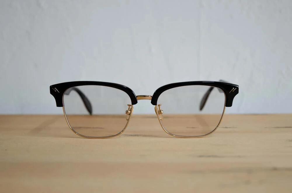 [ Mr.CASANOVA ] STOMP4 / Black×Gold / Light Brown Lens color : Black×Gold size : [ フレーム縦幅:46mm / フレーム横幅:148mm ] [ レンズ横幅:55mm / レンズ縦幅:42mm ] [ 鼻幅:18mm / テンプルの長さ:145mm ] Lens : Light Brown / UV400 ブランドスタートからアップデートをし続けてリリースされているMr.CASANOVAを代表するモデル「STOMP」。 クラシカルな趣が漂うブロウモデルで、50’s、60’sの古き良き時代の不良が愛した音楽を、様々なアプローチで現代に蘇らせた「THE CRAMPS」からインスピレーションを受けたモデルです。 遺物でしかなかったヴィンテージミュージックを、蘇らせた功績をコフィン=棺をモチーフにしたテンプルシェイプ、フロントリムに打ち込まれたサンダーで表現しており、高級感の中にアクセントを付けています。 テンプルには板バネ丁番を採用しているので高い着用感の良さも魅力のモデルです。 こちらはライトブラウンレンズを採用しており、遮光性は高く無いながらも昼夜問わずに着用できる万能カラーです。 ブラウンレンズは肌と同系色でなじみやすく、堀を深く見せてくれる効果があります。 青色の光をカットする効果に優れておりコントラスト効果が高めるので遠方をしっかりと細かく見ることができます。 *度入りレンズ対応モデル