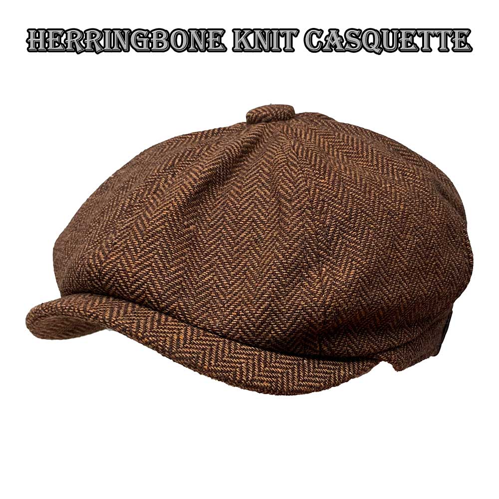 【ネコポス対応】畳める ヘリンボーン ニット キャスケット - ブラウン Herringbone Knit Casquette メンズ レディース ニュースボーイ キャップ ハンチング 帽子 大きい サイズ カーブ 曲がった つば バイザー フリー 無地 ソリッド 日除け 屋外 ユニセックス Brown 茶