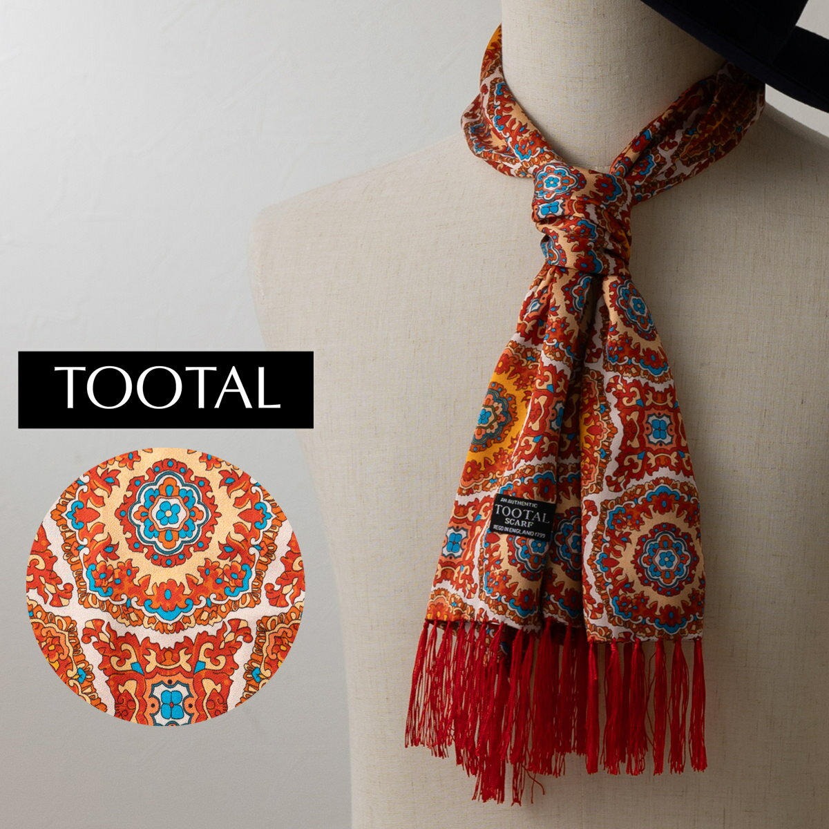 TOOTAL VINTAGE PURE SILK SCARF【unisex】 トゥータル ヴィンテージ ピュアシルクスカーフ ユニセックス カラー / ネクタリン TOOTAL VINTAGE / トゥータル ヴィンテージ 1799年、英国マンチェスターで創業。 モッズに愛された老舗スカーフ専門ブランド。 ポールウェラーやOASISのリアムギャラガーなど多数の著名人も愛用。 伝統を誇るUKの繊維メーカーにより生産された上質の本格派スカーフやネクタイ。 コーディネートのワンポイントに。 首に巻くだけでコーデのアクセントとして存在感抜群。 さりげないフリンジもアクセントに。 男女問わずお使い頂けるデザインのスカーフなので、プレゼントにも喜ばれること間違いなし。 デザイン違いでいくつか揃えるのもおススメです。 素材は美しい艶と高級感溢れる滑らかなピュアシルク100%を使用。 ふんわりと柔らかく肌触りも抜群です。 夏は涼しく、冬には暖かい最高品質のシルクを使っているのでシーズンを 通してご利用いただける万能アイテムです。 TOOTAL VINTAGE スカーフ 一覧 スカーフ・ストール 一覧 DETAIL ◆商品詳細 【 商品名 】tootalTV5913-691 【 カラー 】ネクタリン 【 素材 】ピュアシルク 100% 【 サイズ 】約 幅 25cm × 全長 121.5cm(フリンジ含む)