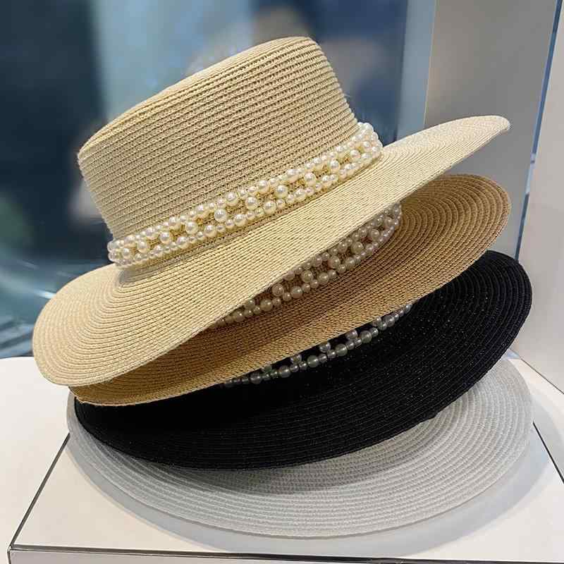 麦わら帽子 レディース 春夏 UVカット 遮光 接触冷感 パール チェーン 平トップ ハット 日よけ 紫外線対策 つば広帽子 おしゃれ かわいい カジュアル エレガント お出かけ 旅行 ブラック ベージュ カーキ ホワイト