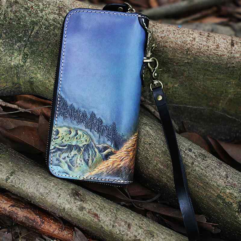 長財布 メンズ 本革 牛革 植物タンニンなめし革 手彫り カービング 狼柄 和風 レトロ ラウンドファスナー セカンドバッグ風 個性的(x3)