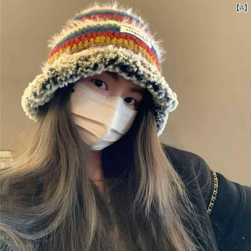 ニット帽 レディース 手編み 秋冬 防寒 暖かい 迷彩柄 カラフル 漁夫帽 バケットハット かわいい