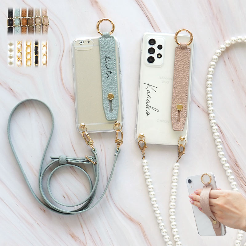 スマホケース ハード 全機種対応【クリアケース×名入れ印刷×レザーベルト×選べるロングストラップ】スマホショルダー ショルダー タイプ ストラップ スマホバンドき 持ち手 iPhone カバー 携帯ケース 肩掛け くすみ ギフト 名入れ無料 メール便送料無料 受注生産【印刷】