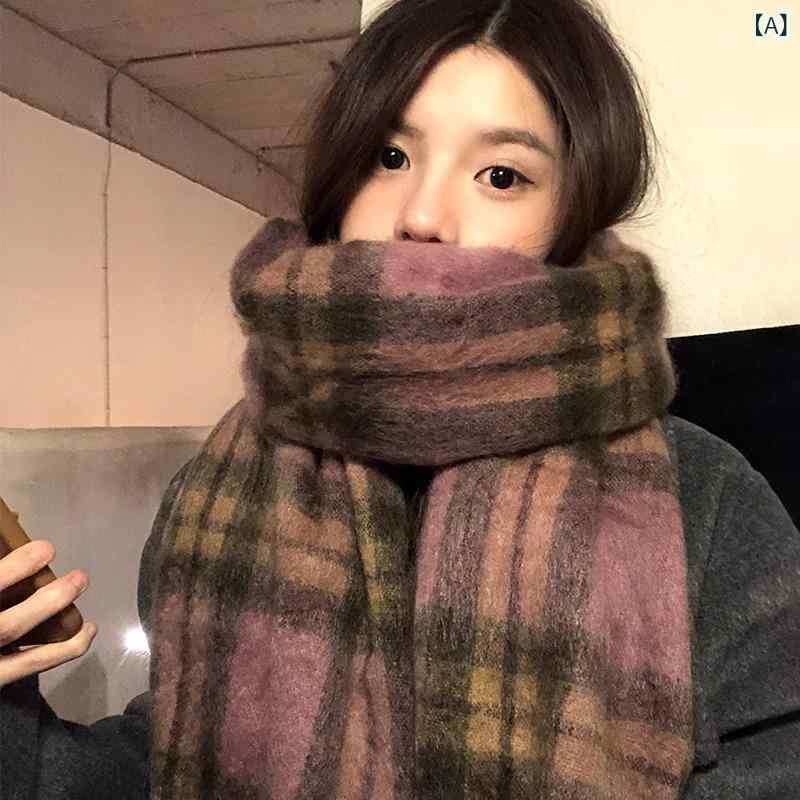 マフラー レディース 女性用 韓国 フェイク ポリエステル チェック柄 レトロ 高級感 厚手 ロング 保温性 防寒対策 秋冬 ピンク ショール ストール 襟巻き