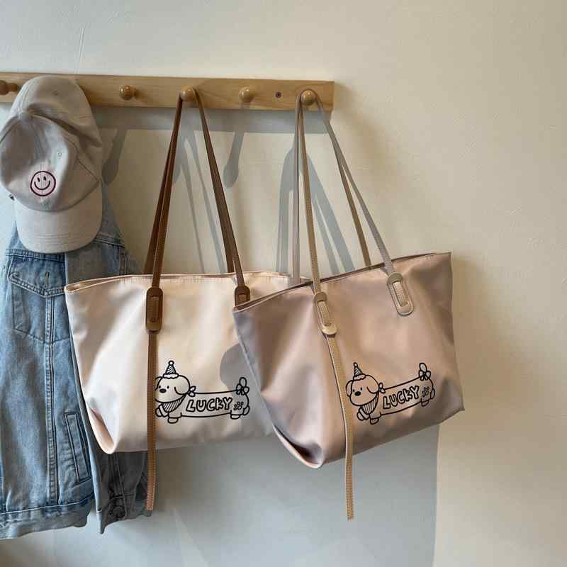 トートバッグ レディース 女性用 犬柄 ドッグ ナイロン 大容量 通勤 普段使い 肩掛け 鞄 カバン ブラック グレー ベージュ
