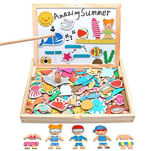 【チョーク付きお絵描きボード】セット内容:描きボード*1個 チョーク*4本 水性ペン*1本 釣竿*1本 磁気スティッカー*110枚 この製品は絵描き、漢字の練習、単語の学び、魚釣りゲームができる多目的知育玩具でございます。お子様の想像力に任せてパズルの組み合合わせや素晴らしいストーリが作れます。この製品を通じて、子供たちの創造性、実現能力、集中力などを向上できる知育玩具でございます。そのため、男の子も女の子も、プレゼントすると絶対喜びます。 【多様な磁気パズル】海洋生物、植物、キャラクターなど全部合わせて110枚含まれており、子供達の無限創作欲求を満たしてあげます。海洋生物、植物等の単語も覚えながら、お子様の知識面を幅広く持たせることができます。明るい色と可愛い形は子供たちのゲームへの熱意を高めます。 【収納便利】収納ボックスは持ち運びやすく、時間場所問わず、思いっきり遊べるのが特徴でございます。ゲームをするたびに片付ける必要がございますが、幼い頃から収納のいい習慣を身につけることは大事でございます。 【絆・教育】親子と仲間との絆を育めるのがねらい目! ゲームを一緒に楽しむと、様々なパズルを使用し、子供達にいろんな知識を教えられますし、子供たちの視野を広げ、能力を向上させます。学習教具に最適:家庭、学校、または教室の教材。ゲームをすることで、子供たちの想像力、創造性、実践能力、学習能力などがすべて向上します。本製品モンテッソーリおもちゃは女の子や男の子への知育玩具としてピッタリでございます。 【ギフトに最適】:子供、大人、お年寄りみんなが楽しめる!本製品はあらゆる年齢層にとって素晴らしい教育ツールです。子供には学習ツールとして、大人には脳トレのおもちゃ、お年寄りには認知症防止、どんな年齢層にもふさわしいプレゼントです。出産お祝い、入園お祝い、お誕生日、こどもの日など特別な日にプレゼントするときっと喜んでもらえます。