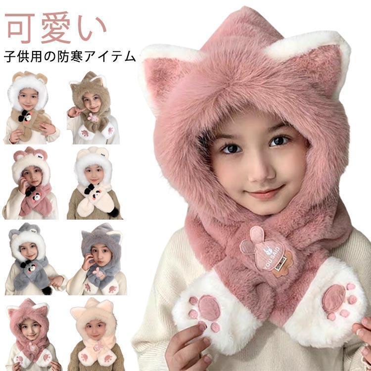 帽子 マフラー キッズ 一体 ベビー フード 付き 冬 防寒 フードウォーマー 子供 耳付き 男の子 女の子 一体型 くま くま耳 ファー もこもこ
