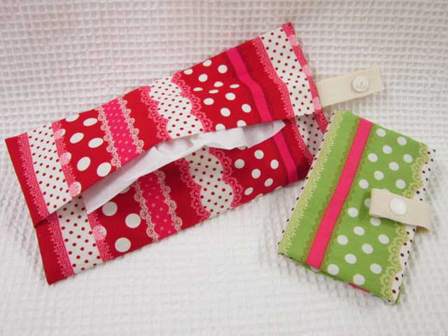 +++++++++++++++++++++++++++++++++++++++++ ボックスティッシュの中身を詰め替えて使用する、携帯ティッシュケースのオリジナルキットです。折りたたんでスナップボタンで留めるので、コンパクトな手のひらサイズで携帯できます。 とてもカンタン!ポケットティッシュがいらないのでプチエコ!! +++++++++++++++++++++++++++++++++++++++++ ★キット内容 ≪Sweet Decoration Border≫ レースとドット柄生地 生地巾×40cm 綾テープ20mm巾 20cm ワンタッチスナップ 1組 作り方(レシピ)