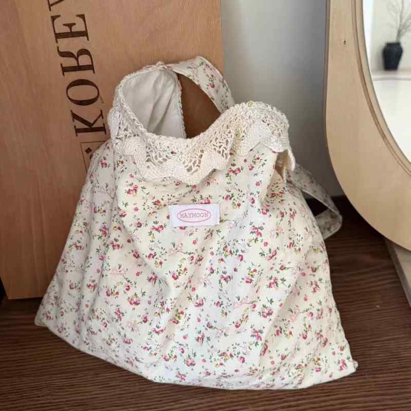ショルダーバッグ レディース かわいい ガーリー 大人 韓国 甘い 大容量 キャンバス 春夏 レース エッジ 花柄 柔らかい トート レジャー 普段使い ピンク