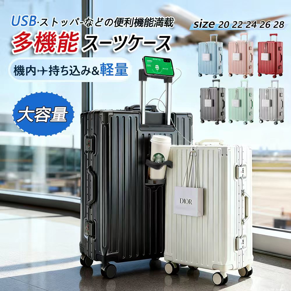 高耐久 アルミ キャリーケース [ Sサイズ 機内持ち込み OK ] Mサイズ Lサイズ 多機能 充電 USB type-c カップホルダー 1泊 2泊 3泊 5〜7泊 2泊3日 ストッパー付 キャリーケース キャリーバッグ スーツケース 軽量 旅行 出張