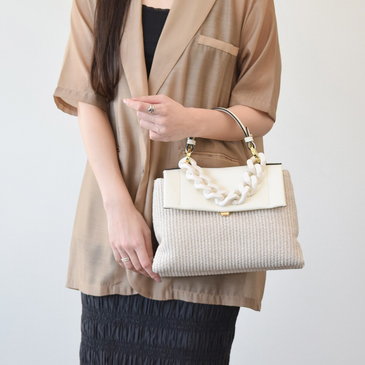 [型番:Q56413]2002年イタリア、アブルッツォ州にて創業されたブランド、ロリステッラ。デザイン、パターン、ファブリック、縫製まで徹底したMade in italyにこだわり、モダンでスタイリッシュなフォルムにフェミニンな要素を取り入れたデザインは欧州を中心にとても人気があります。レザーと涼しげな雑材を使用したハンドバッグは同系色のアクリルチェーンがフェミニンな印象です。※生産過程に生じるキズが多少ある場合がございます。また素材の特性上、若干の色ムラ、擦れが見られる場合がございますが、こちらは素材の特性となります。※撮影時の光の当たり具合により色味が違って見える場合がございます 。また、お客様のお使いのPCモニターやスマートフォン画面などの環境により色味が実際の商品と違って見える場合がございます。予めご了承ください。※サイズ換算(表記)はあくまで目安となります。幅:約26-29cm高さ:約20cmマチ:約12cm持ち手高さ:約11cmショルダーストラップの長さ:約82-111cm重さ:約710g■カラー:ホワイトコンビ※( )で表記されている数字はヌードサイズです。ヌードサイズとは衣服を身につけない身体のサイズです。お客様ご自身の身体サイズと比較してお選びください。 ■素材: 表素材:天然草木 ■お手入: >>商品のお取り扱い方法 ■原産国: イタリアLORISTELLA◆アクリルチェーン異素材コンビバッグ/ブリジットバーキンセレクト(Bridget Birkin Select)ホワイトコンビ画面上と実物では、多少色具合が異なって見える場合がございます。