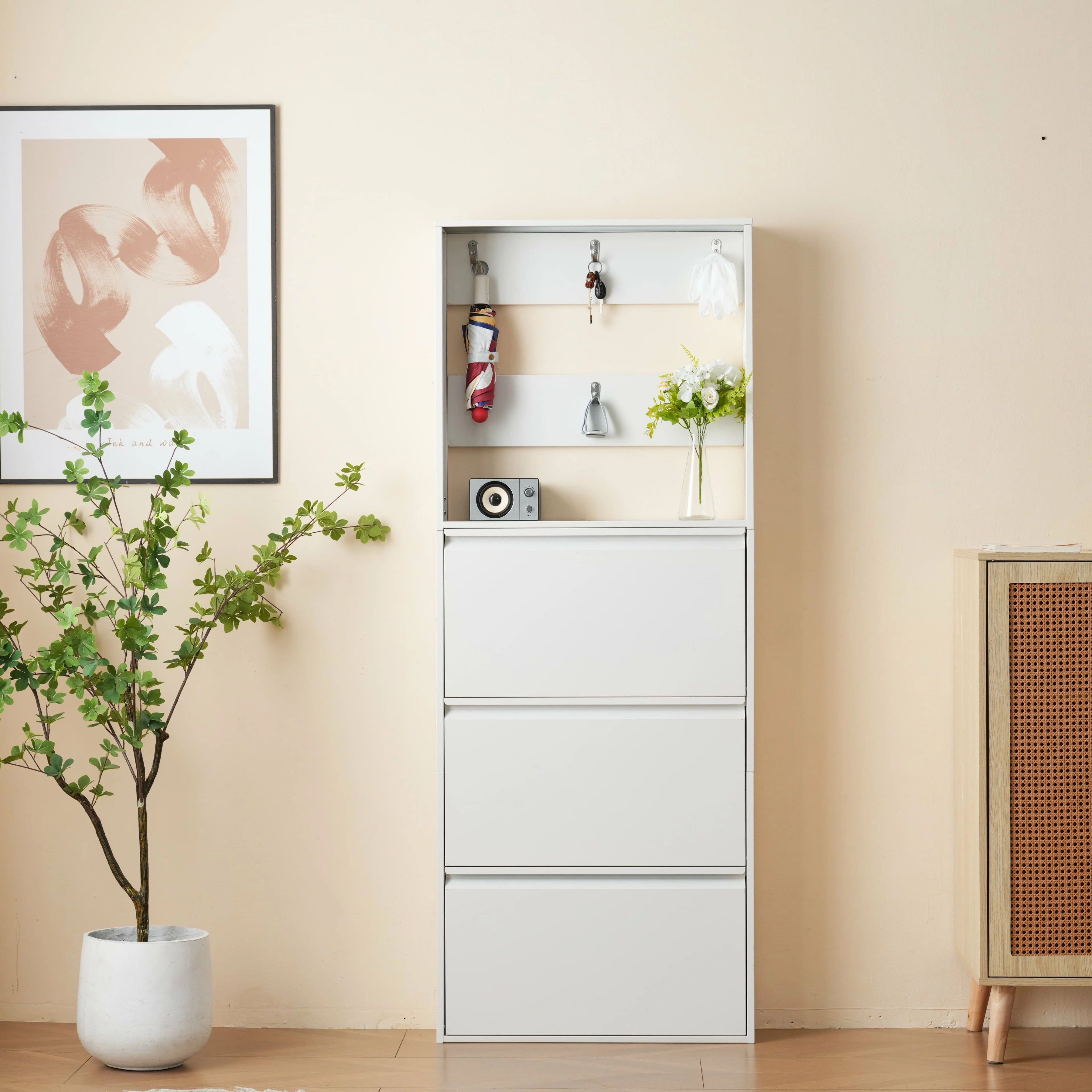 3段ラック-棚付き シューズラック スリム 靴箱 シューズボックス 下駄箱 省 スペース 超薄型 3段 シューズラック くつ箱 靴入れ 収納ラック エントランス 靴収納 靴収納棚 木製下駄箱 一人暮らし おしゃれ 超スリム型 消臭 ホワイト