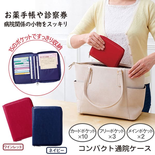 【注意事項】お届け方法は送付先のポストへ投函される「ネコポス」の為、支払い方法で商品代引きは不可になります。日時指定は出来ません。 商品名 コンパクト通院ケース 商品説明 病院関係の小物をまとめて収納! 通院時の忘れ物防止に!お薬手帳や診察券など病院関係の小物をまとめて収納。 両開きで見やすく、持ち運びに便利なコンパクトサイズ! 収納枚数 カード10枚、お薬手帳1冊 ・メインポケット×2 …お薬手帳、医療証など ・カードポケット×10 …カードや保険証、診察券など ・フリーポケット×3 …領収書、お薬の説明書など 個装サイズ 重量 (約)W16×L19×H2cm/(約)99g サイズ 閉じた状態/(約)12.5×17×2cm 開いた状態/(約)26×17×1cm カラー ネイビー、ワインレッド 材質 本体/合成皮革(ポリウレタン) ポケット/ポリエステル ご使用方法 【お手入れ方法】 ●汚れた場合は、きれいな布で拭いてください。 使用上のご注意 【使用上の注意】 ●強い磁気を発生する物との同時収納はお避けください。万一、カードデータに影響を及ぼしても当社および販売店は一切保証を負いかねます。 ●幅の広いカードや厚みのあるカードは収納できない場合があります。その場合は、フリーポケットを使用してください。 ●素材の特性上、摩擦や水濡れ等により色が移る場合がありますので注意してください。万一、色移りした場合は早めに洗濯してください。 ●用途以外には使用しないでください。 【保管上の注意】 ●火気付近では保管しないでください。 ●素材の特性上、加水分解により経年劣化が生じ、劣化や破損する場合がありますので、高温多湿の場所での保管はお避けください。 販売者 アイメディア株式会社 製造国 中国 【関連キーワード】お薬手帳 診察券 収納 ケース バッグ 通院時 忘れ物防止 通院用ケース 通院バッグ 通院用バッグ 通院 通院用 病院通い 通院時 医療証 カード 保険証 忘れ物 防止 便利 グッズ 送料無料 おすすめ 人気 通販 販売