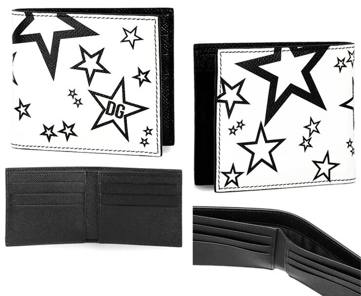 DOLCE&GABBANA D&Gドルチェ&ガッバーナメンズ二つ折り財布 ブラックカードケース ドルガバ箔押しロゴ ブラックロゴプレートDGスター ホワイト 星D&Gロゴプリント カーフスキンレザー2つ折り財布 札入れテキストグラフィティプリント