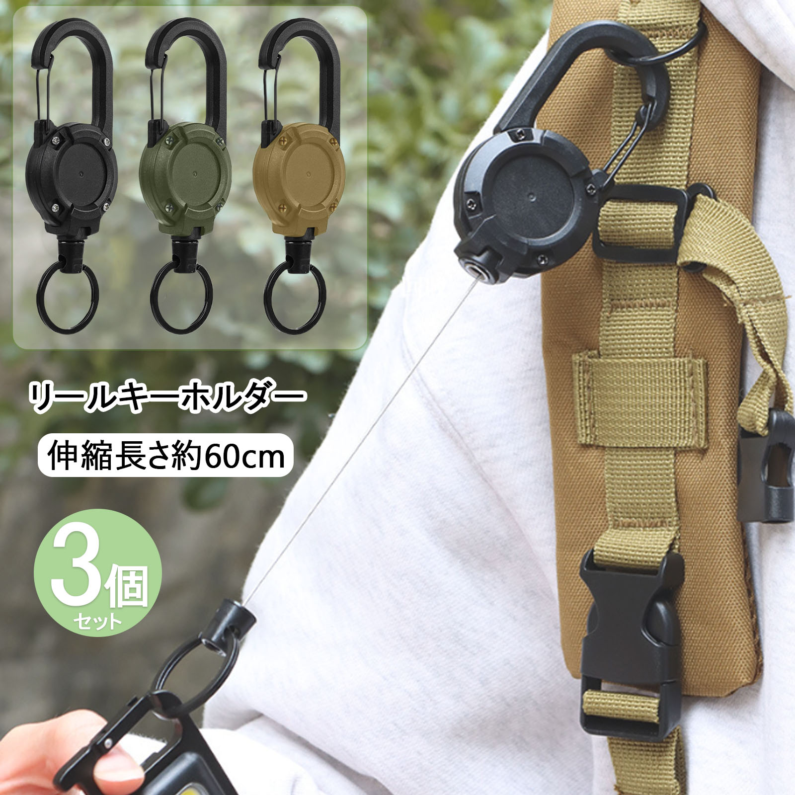 【3個セット】リールキーホルダー カラビナ付き キーリール 多機能 バッグチャーム 伸びるリールキーホルダー 軽量 丈夫 紛失防止 吊り下げ名札 パスケース 鍵 カードケースホルダー 推し活 便利 キャンプ ハイキング 釣り メール便送料無料