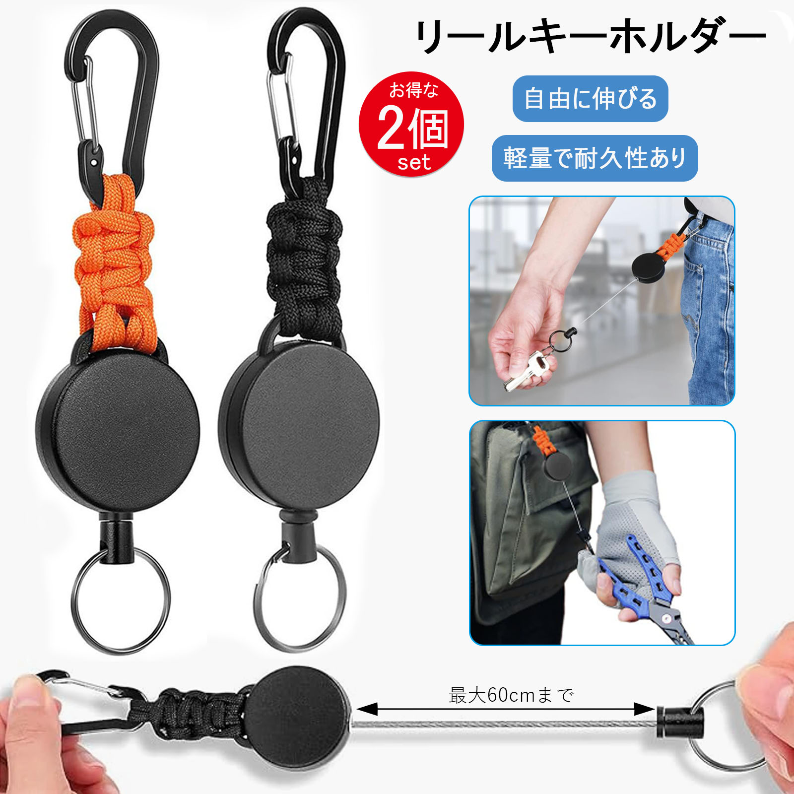 【2個セット】リールキーホルダー カラビナ付き キーリール 多機能 バッグチャーム 伸びるリールキーホルダー 軽量 丈夫 紛失防止 吊り下げ名札 パスケース 鍵 カードケースホルダー 推し活 便利 アウトドア用 黒+オレンジ メール便送料無料