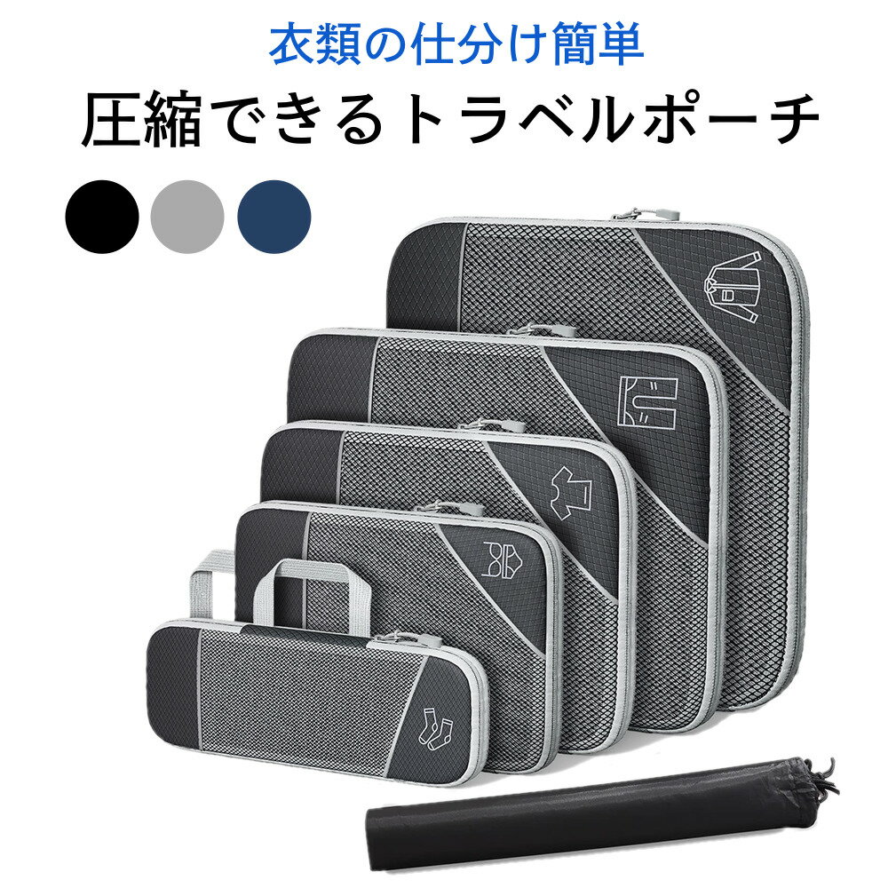 【6点セット】 圧縮機能付きトラベルポーチ 旅行ポーチ 収納袋セット パッキング 多機能 トラベルグッズ ベルト付 防水 ポリエステル ナイロン 旅行カバン スーツケース 収納 ポーチ アメニティ ケース 巾着袋 折りたたみ可能 メッシュ