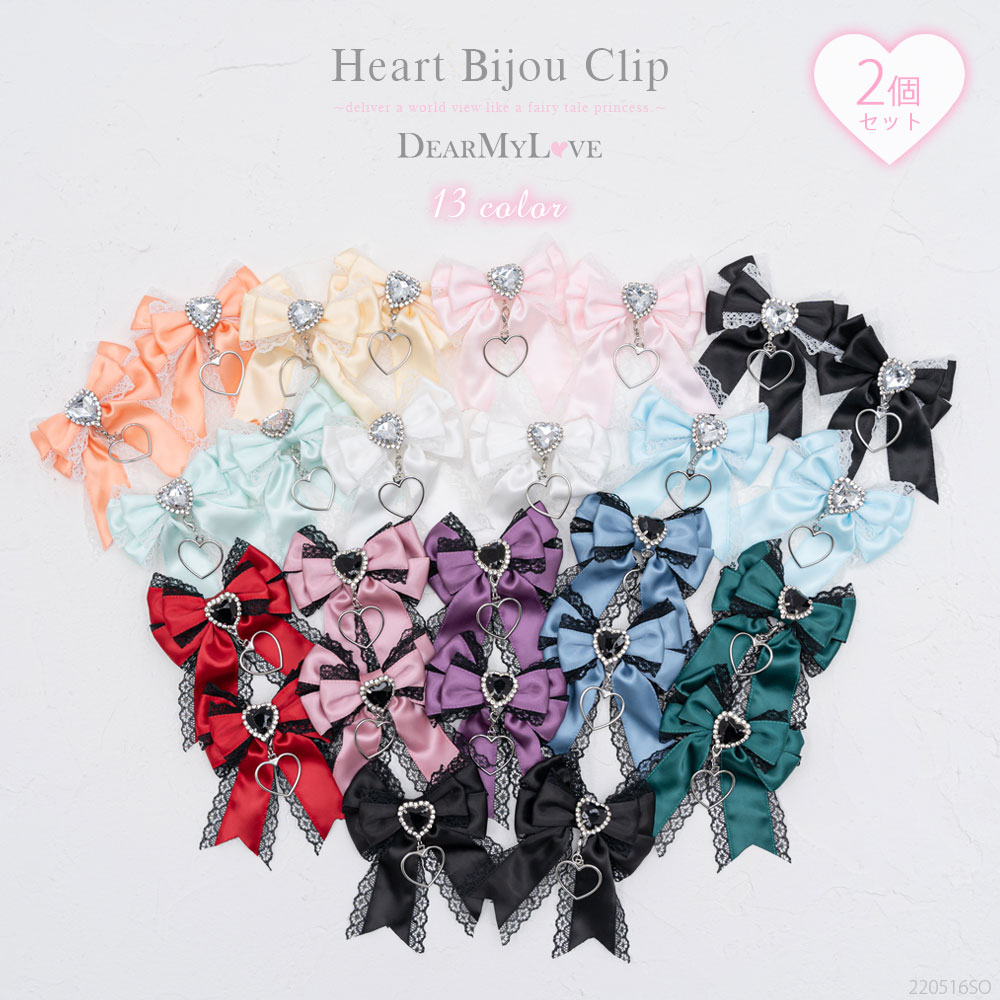 キラキラハートビジュー2個セットリボンクリップ レディース ファッション小物 アクセサリー ヘアアクセ ヘアクリップ リボン サテン レース ビジュー ハート レッド ピンク パープル ブルー グリーン ブラック オレンジ イエロー 推し 推し活 参戦服 夢展望 DearMyLove