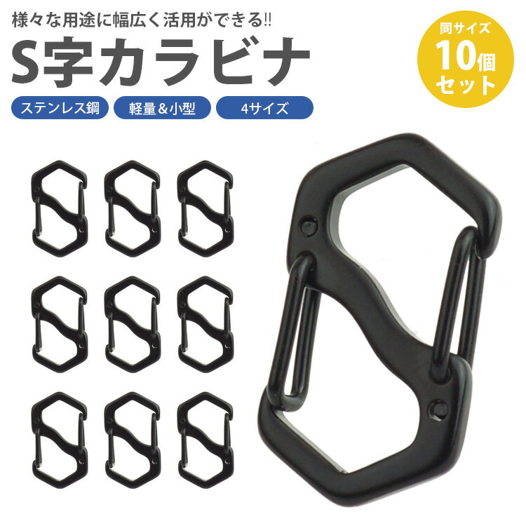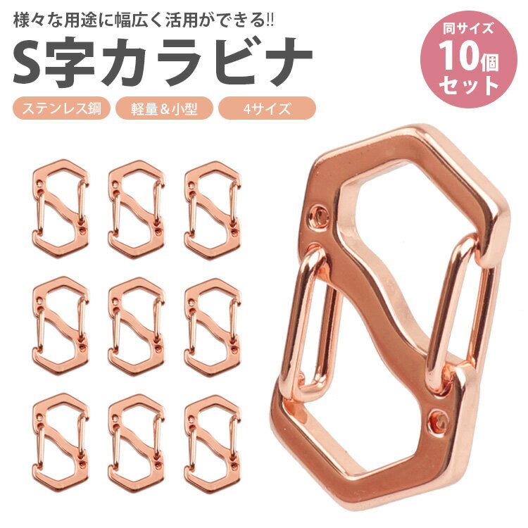 S字型 フックが2か所になっているので 取り付けや取り外しを別々に行うことができます。 軽量&小型 ステンレス鋼製の小型デザインで1個あたり約0.5g〜約1.8gと軽量 幅広い用途に アクセサリーの接続パーツとしても使える シンプルでおしゃれなデザイン。 同サイズ10個セットで様々なものに取り付けやすい! 商品詳細 サイズ:画像参照 重量:画像参照 材質:ステンレス鋼 個数:同サイズ10個 製造国:中国 ※機械による生産過程により、カラビナのゲート部分が硬く開閉しにくい場合がございます。 ゲート部分が硬い場合は、一度定規などの道具を押し当てて開いてからご使用ください。 ※若干のサイズや重量の誤差はご了承ください。 ※輸入品のため、製造・輸送中に小傷等がある場合があります。 ※ご閲覧の環境等により色味などが実際の商品と異なって見える場合があります。 ※仕様は改善の為に予告なく変更する場合があります。 ※この商品はメール便での配送となります。 ※宅配便での配送、代金引換、日付指定やあす楽の対応はできませんのでご了承ください。