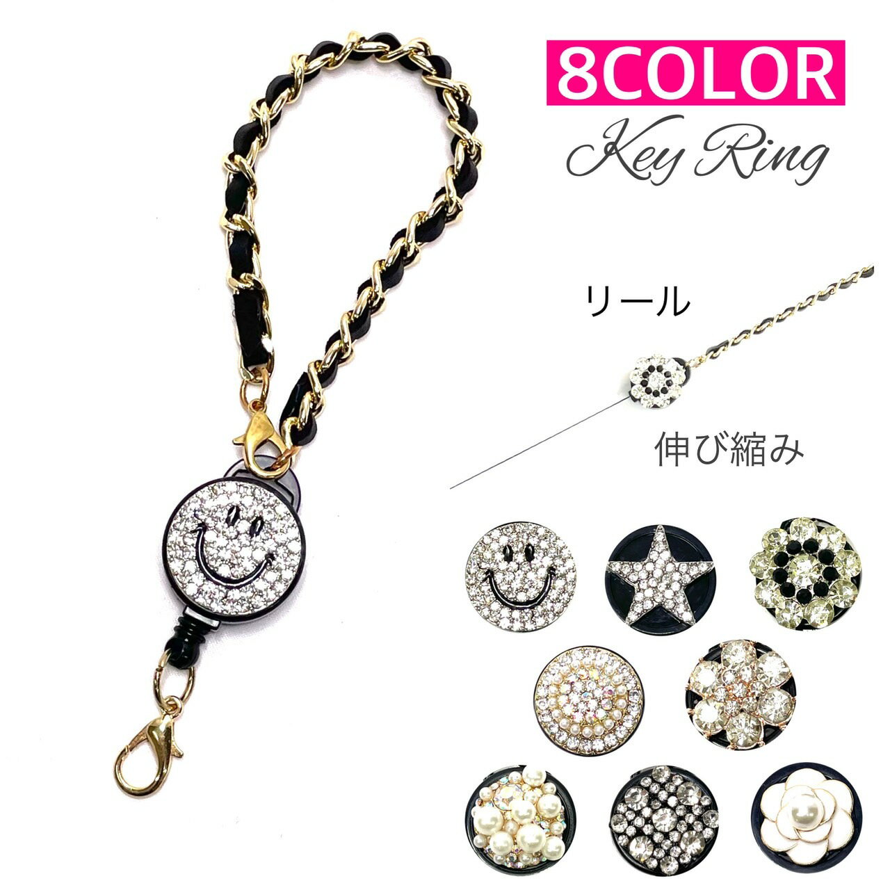 ストラップ リール付き 伸びる 鍵 チェーン キーホルダー バッグチャーム ICカード 定期入れ 軽量 キラキラ スマイル モチーフ 星 花 パール レディース プレゼント ギフト オシャレ 上品 ブランド 雑貨 パーツ スマホショルダー かわいい 送料無料 ラッピング無料 新作
