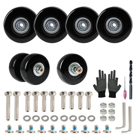 商品仕様:超静音シリーズ用交換タイヤキット。キット内容:4*キャスター(車輪)、10*ボルト(車軸30mm*4、35mm*4、60mm*2)、10*ネジ、8*ワッシャー、6*φ8軸用変径スリーブ、1*多用途改良防護手袋、2*六角レンチ、電動補助工具(1*ドリルビット・1*研磨ヘッド-サービス品)、1*日本語説明書。 スーツケース交換キャスター:輪外径45mm、輪幅18mm、軸受部幅21mm、輪中心軸孔径6mm。シングルキャスターとダブルキャスターに対応、取り付け幅が21mm以上であることを確認し、古いキャスターの直径をミリ単位で測定して、摩耗部分や測定誤差も考慮してください。キャスターの回転には1mmの隙間を確保してください。 適用範囲:ショッピングカートスーツケースキャリーボックスなどの車輪補修用、キャスター取替え、消耗したキャスターを自分で簡単に交換!交換方法は説明書の手順にご参考ください。高品質なゴム素材を採用しています快適な走行性と磨耗しにくい静音タイプです。
