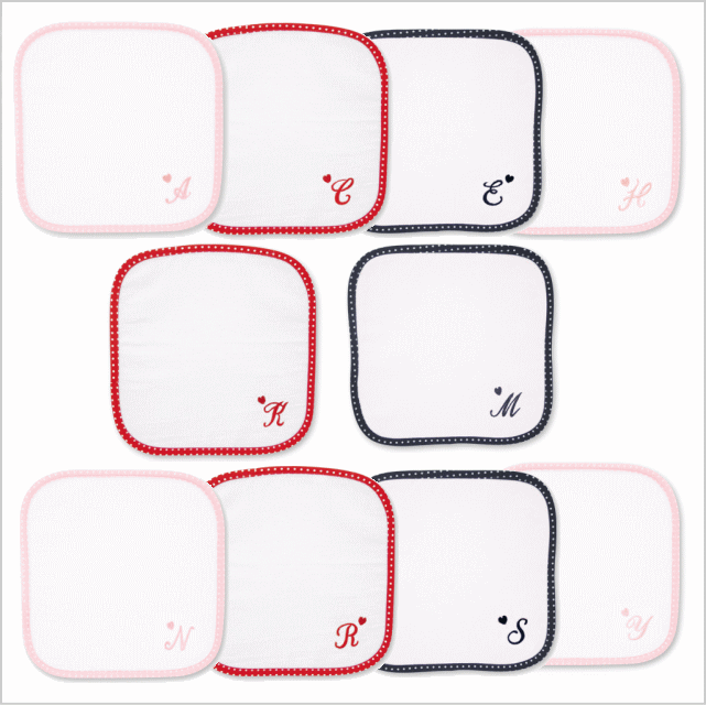 メール便(補償なし・発送から2~3日ほどでポストへお届け)です。 他商品と同梱の場合は 宅配便料金(通常)となります。 ギフトラッピング不可 ●素材: コットン ●サイズ: H25×W25cm ●ハートつきイニシャルとドットプリントのトリミングが キュートなタオルハンカチ! 自分用はもちろんのこと、ベビちゃんや大切な方の イニシャルもどうぞ・・・♪ プチギフトもピッタリです!