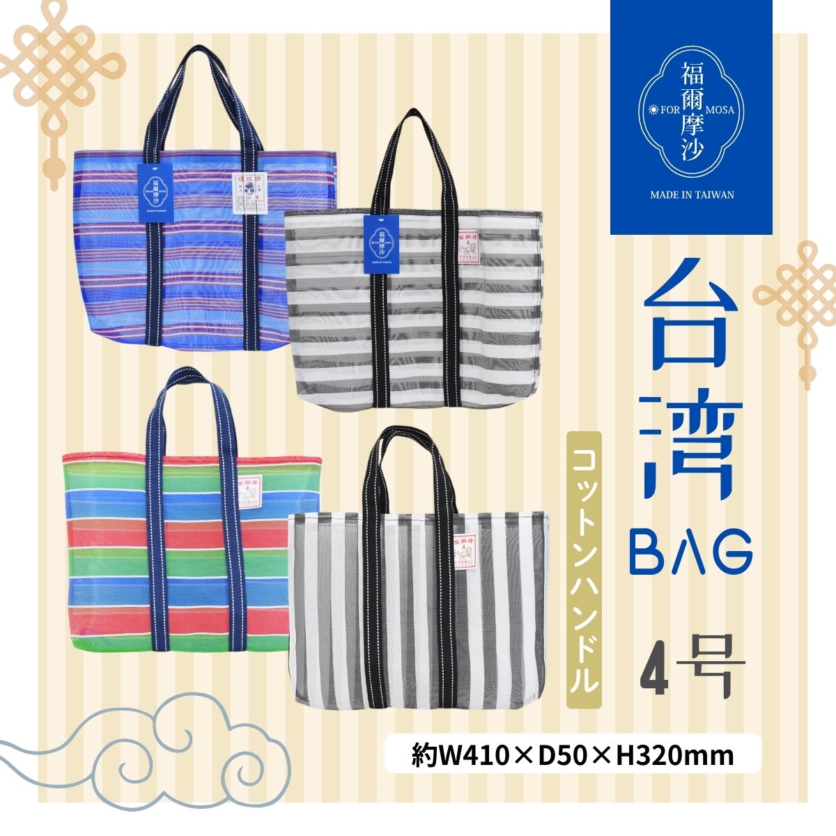 ITEM INFORMATION 商品説明 どこか懐かしい感じの配色のレトロ感あふれる、台湾バッグ。 台湾旅行のお土産としても近年人気が出ております。 台南の北部、後壁区が発祥地とされており、 ハンドメイドで縫製されております。 丈夫なメッシュ生地で強度も抜群。 サイズにより、毎日のお出かけやアウトドア、レジャー、 さまざまな用途、シーンでお使いいただけます。 -------------------------------------------------------------- 6号サイズ 濡れても大丈夫な素材なので、ジムやアウトドアの シーン、 お子様との屋外のお出かけにオススメ。 お買い物バッグとしても。幅広い用途で使用できます。 コットンハンドル 持ち手部分をコットン風素材にチェンジしております。 ※こちらのタイプは持ち手が少し長めの為、肩掛けできます。 -------------------------------------------------------------- 台湾 台湾バッグ 漁師網バッグ 茄?袋 MADE IN TAIWAN 材質・生産国 本体:ポリエチレン 持ち手:ポリプロピレン 手洗い○ 台湾製 サイズ W500×D50×H370mm 持ち手:約500mm 備考 モニターの発色により実際のものと色が異なって見える場合がございます。ご了承ください。 ※ご購入前に必ずご確認ください※ 本商品は折り畳んだ状態で梱包いたします。開封直後は折りジワがついている場合がございますが、広げてしばらく置いていただくことで自然に目立たなくなります。 ※ご購入前に必ずご確認ください※ ハンドメイド商品のため、ひとつひとつに個体差がございます。生産ロットにより、生地の色味やタグの種類、タグの位置などに違いが見られる場合がございますが、いずれも製品の特性によるもので、不良品ではございません。これらの理由による返品・交換はご遠慮くださいますよう、あらかじめご了承ください。
