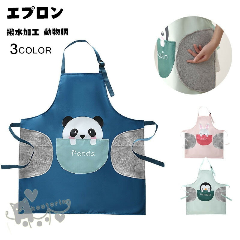 エプロン 可愛い 即納 パンダ うさぎ ペンギン 手ふきタイプ ポケットあり 防水 防油 カフェ風 幼稚園 料理教室 男女兼用 動物 小物 男女兼用 送料無料