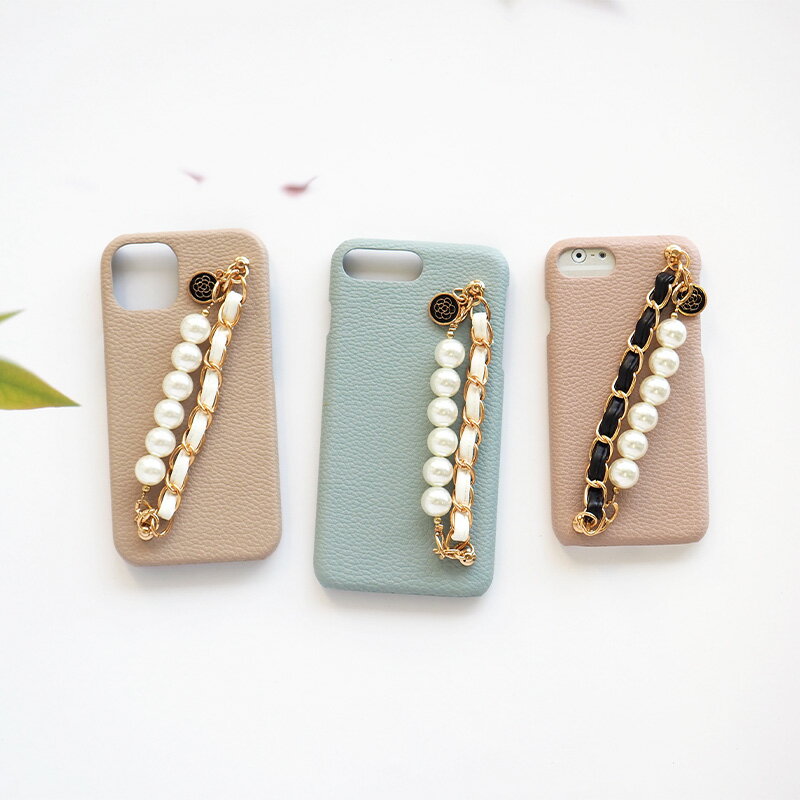 スマホケース スマホカバー iPhoneケース【レザーハードケース×カメリア付き2連チェーンベルト】持ち手 iPhone ケース カバー 携帯ケース スマホベルト 落下防止 手 指 固定 ベルト レザー ギフト メール便送料無料 受注生産