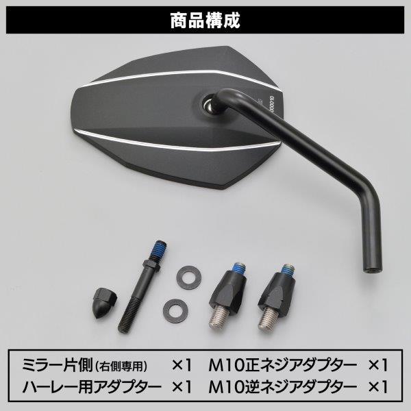 アルミハウジングにコントラストカットを施したハーレーダビッドソン用ミラー。オーソドックスなラウンド形状にモダンなテイストを加えたハウジングを採用。振動に強く後方視界に優れる、直径12mmの極太ロングロッド。ハーレーダビッドソンの他、付属の10mmアダプターで国産車にも装着可能。ハウジング:アルミ製ブラックアルマイト&コントラストカット鏡面:曲率R1250のクリアーミラー●右専用の片側1個入り●アルミ製ハウジング:シャープなデザインのコントラストカット / 曲率:R1250 クリアーミラー●ブレない極太ロッド:直径12mmのロッドで振動の多いバイクでもミラーがブレにくい●110mmのロングロッド:鏡面が外側になることによって、腕や肩が視界を遮らない●ミラーアダプター:ハーレーダビッドソン用+10mmネジ用でハーレーと国産車に装着可能※ HDアダプターを使用する場合は2007年以降新保安基準適合。※ 10mmアダプターを使用する場合、鏡面積は新保安基準に適合したサイズですが衝撃緩衝装置が無いため、新保安基準適合外となります。※ ハンドル下側に装着する場合は、左右のミラーを反転させてください。