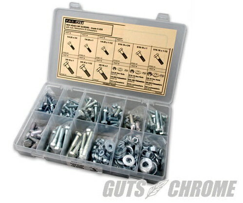 【適合】ハーレー汎用HEXボルト&ナット、ワッシャーセット ジンク 粗目(インチサイズ) 306PC強度 グレード5、ZINC(亜鉛メッキ)仕上げ専用クリアプラケース付き。スチールケースタイプよりも安価で収納にも便利なミニサイズバージョンです。ケースにサイズも表記されているので保管時にもきっちり整頓できます。■ボルト1/4"-20×3/4" (約19mm長) 20本1/4"-20×1"(約25.4mm長) 15本1/4"-20×1-1/2"(約38mm長) 15本5/16"-18×3/4"(約19mm長) 10本5/16"-18×1"(約25.4mm長) 10本5/16"-18×1-1/2"(約38mm長) 10本3/8"-16×1"(約25.4mm長) 8本3/8"-16×1-1/2"(約38mm長) 8本3/8-16×2"(約51mm長) 8本■ナット1/4"-20 25個5/16"-18 15個3/8"-16 15個1/4" 25個5/16" 15個3/8" 15個■スプリングワッシャー1/4" 25個5/16" 25個3/8" 15個※別途単品でも販売しております。【商品名】HEXボルト&ナットセット 粗目 ジンク 306PC【商品番号】G11-GC-77468【メーカー】GUTS CHROME(ガッツクローム)【適合】ハーレー汎用