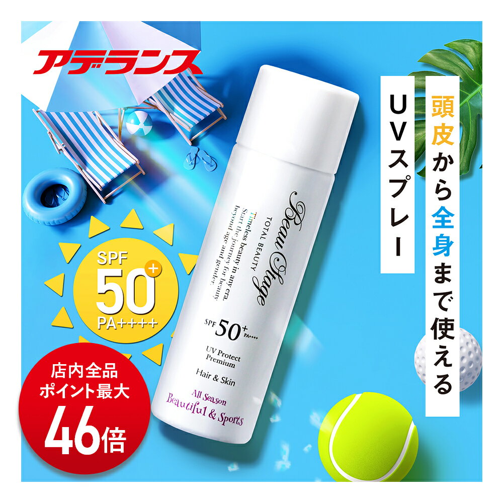\業界最高水準のUVブロック!/ 保湿・消臭成分配合のスプレータイプの日焼け止め。 髪や頭皮だけでなく全身に使えて紫外線をしっかりブロック! ●SPF50+ PA++++ ●近赤外線カットパウダー配合 ●べたつかない!白浮きしない! ☆見落としがちな髪の毛に注目 スカルプケア・ヘアケア成分を強化 紫外線の影響を受けても2つの成分が潤いを与えパサつきをケアします。 ・アルガンオイル ・天然型セラミド(セラミドNG、セラミドNP、セラミドAP) ※配合目的:保湿 【ビューステージ UVプロテクト プレミアム ビューティフル&スポーツ】 内容量 80g 特徴 アデランスのUVプロテクトなら、シュッとひと吹き!カンタンしっかりUVケア。髪・頭皮・全身に、カンタンひと吹きで使えて、紫外線をしっかりブロック!!業界最高水準の紫外線カット* SPF50+/PA++++。ベタつかない、 白浮きしない、缶を逆さにしてもOK。*2017年5月現在の基準。SPFはUVB、PAはUVAからの防御力を示します。 ご使用方法 ご使用前に缶の中の球がカチカチと音がするまで缶を上下に強く振ってください。お肌から約10〜15cm離し、適量をスプレーしムラなくのばしてください。 効果を保つため、こまめにつけ直してください。顔に使用する場合は、一度手のひらに取ってから少量ずつのばしてください。 ご使用上の注意 ●お肌に異常が生じていないかよく注意して使用してください。お肌に合わない場合、使用中や使用後に直射日光に当たって赤み、はれ、かゆみ、刺激、 色抜け(白斑等)や黒ずみ等の異常が現れた時はご使用を中止し、皮フ科専門医等へご相談することをおすすめします。●直接吸入しないようご注意ください。 ●同じ箇所に連続して3秒以上噴射しないでください。●目に入らないようにご注意ください。目に入った時はすぐに洗い流してください。●乳幼児の手の届かない所に保管してください。 ●捨てる時は火気のない戸外で噴射音が消えるまでボタンを押してガスを抜き、お住まいの地域のルールに従って捨ててください。●アルコール過敏症の方、肌の弱い方は使用しないでください。 ●衣類につくとシミになることがあるため、すぐに洗剤で丁寧に洗ってください。塩素系漂白剤は使用しないでください。 成分 LPG、エタノール、シクロペンタシロキサン、メトキシケイヒ酸エチルヘキシル、パルミチン酸エチルヘキシル、ポリメチルシルセスキオキサン、 ジエチルアミノヒドロキシベンゾイル安息香酸ヘキシル、ポリヒドロキシステアリン酸、水、BG、アルガニアスピノサ核油、シア脂、セラミドAP、 セラミドNG、セラミドNP、テトラヘキシルデカン酸アスコルビル、ホホバ種子油、マンゴー種子油、酸化チタン、シャクヤク根エキス、チャ乾留液、水酸化Al、 アルゲエキス、メマツヨイグサ種子エキス、キハダ樹皮エキス、酸化亜鉛、カミツレ花エキス、セイヨウオトギリソウ花/葉/茎エキス 、トウキンセンカ花エキス、 フユボダイジュ花エキス、ヤグルマギク花エキス、ローマカミツレ花エキス