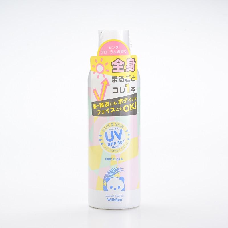 シュッと手軽に塗りなおし可能。 髪にも使えて、素早くUVケアする、さらさらスキンケアUVスプレー。 きめ細かいミスト状で肌に均一に密着。 汗・水、そして空気中の水分でUVブロック膜が強くなる技術搭載。 スーパーウォータープルーフ。 せっけんで落とせる。 耐こすれ。顔・からだ・髪用。 フルーティーフローラルの香り 使用感:さらさら 【使用方法】 ●缶を上下に強く振ってからお使いください。肌や髪から10〜15cm程度はなしてスプレーし、たっぷりムラなくなじませます。使用量が少ないと、十分な紫外線防御効果が得られません。 ●汗をかいたり、タオルで拭いた後などは必要に応じて塗りなおしてください。 ●顔に使用する場合は、直接の噴射はさけ、1度手のひらに出してから少量ずつなじませてください。メイクの上からお使いになる場合も同様にお使いください。メイクがよれないようにご注意ください。 ●落とすときには、普段お使いの洗浄料、シャンプーなどで、丁寧に洗い流してください。 【使用上の注意】 ◆火気と高温に注意:高圧ガスを使用した可燃性の製品であり、危険なため、商品に記載されている注意をよく守ってご使用ください。 ◇吸入しないようにご注意ください。 ◇凍傷の危険がありますので、同じ箇所に連続して3秒以上スプレーしないでください。 ◇目に入らないように注意し、入ったときはすぐに洗い流してください。 ◇ご使用後は容器の口もとをきれいに拭き、必ずキャップをきちんと閉めてください。 ◇衣服についた場合は、すぐに洗剤で丁寧に洗ってください。洗う際には、ピンクに変色しますので塩素系漂白剤のご使用はさけてください。 ◇家具、小物、ネイル、革製品などにつかないよう十分ご注意ください。色落ちしたり、傷める場合があります。 ◇乳幼児の手の届かないところに置いてください。 ◇缶がさびると破裂の原因になりますので、湿気の多いところに置かないでください。 ◇捨てるときは、火気のない戸外で噴射音が消えるまでボタンを押し、ガスを抜いてください。 ※商品のSPF表示及びPA表示は、国際SPF試験法に定められている塗布量1cm2あたり2mgを皮ふに塗布して測定した結果です。