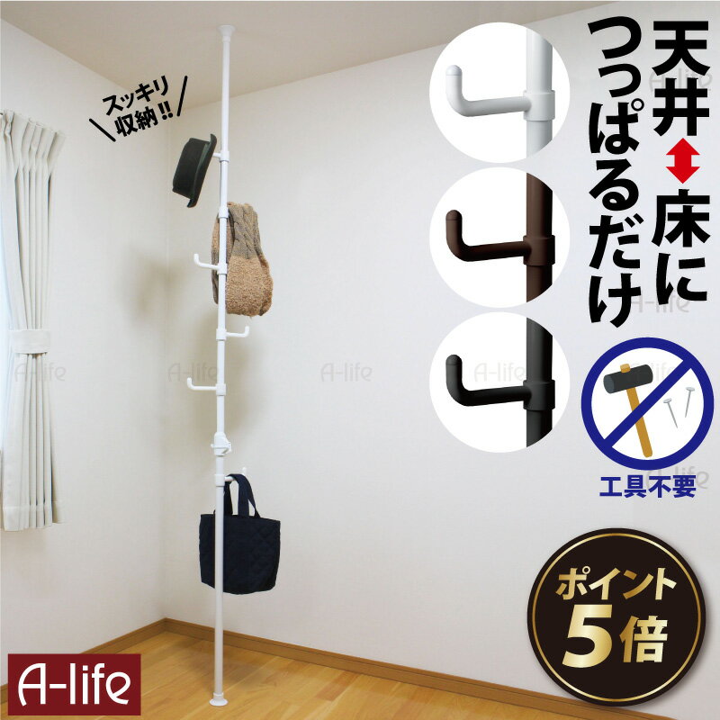 【ポイント5倍!BLACK FRIDAY限定!】つっぱりポールハンガー 突っ張り棒 つっぱり棒 ポール ハンガー 伸縮 ダブルフック 調節棒 天井 室内干し ポール ホワイト ブラック ブラウン おしゃれ 収納 ハンガーラック コートハンガー 送料無料