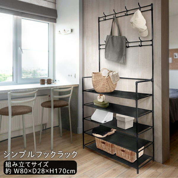 【本日ポイント5倍!】送料無料 ! フック付きラック 5段 簡単組立て 引っ掛け 収納ラック 横80cm 奥28cm【 シェルフ 棚 スチールパイプ ジョイントラック 衣類 帽子 リビング 玄関 靴箱 インテリア 家具 おしゃれ 軽量 】 送料込 140S◇ ラック5段T