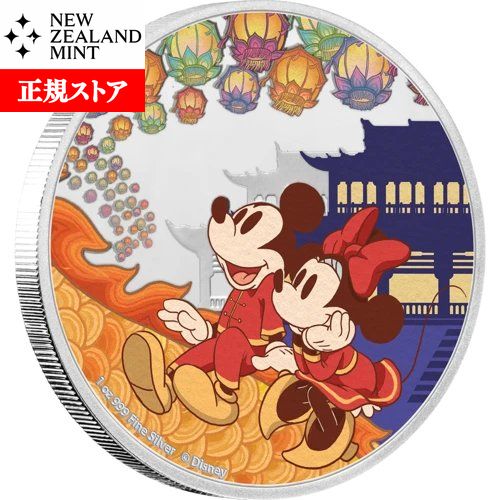 野口コインはニュージーランド造幣局の正規販売店です。ディズニー子年コインシリーズの1つです。コイン裏側には、中華文化圏で春節等に行われる龍舞の上から空へ昇っていく天灯の列を眺めるミッキーマウスとミニーマウスが描かれています。通常の1オンス銀貨より面の広い径50mmの大径コインとなっています。限定: 3000 枚品位: 99.9%の銀製直径: 50 mm重量: 1トロイオンス (約31.1 g)※銀貨は指紋等が付きますと、色が変わる事がございますので、直接お手を触れられる際は、手袋をされる事をお勧めします。商品特徴【 コイン 地金 ギフト 現物資産 シルバー 貴金属 Ag Silver 銀地金 】【型番】nz1591067481