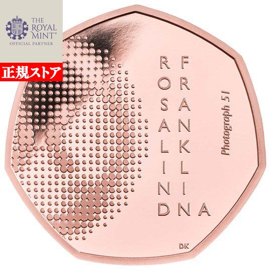 野口コインはイギリスのロイヤルミントの正規販売店です。DNAの二重らせん構造発見に大きく寄与したイギリスの女性化学者、ロザリンド・フランクリン(1920-1958)の生誕100周年を記念するコインです。コイン裏側の左半分には、フランクリンが1953年に撮影し、DNA2重らせん構造発見のきっかけとなったX線解析写真、Photograph 51(51番写真)の画像イメージが点描状に再現されており、右半分にはロザリンド・フランクリンの名前と、代表的功績となったPhotograph 51の名称が記されています。縦書きに記されたロザリンド・フランクリンの姓名の末尾2字(D,N)の横にAの字を配置することで、DNAの文字列が浮かび上がる意匠になっています。・Rosalind Franklin 2020 UK 50p Gold Proof Coin限定: 250 枚品位: K22 (約91.67%)直径: 27.30 mm重量: 15.50 g商品特徴【 コイン 地金 ギフト 現物資産 ゴールド 貴金属 Au Gold 金地金 】【型番】UK20RFGP