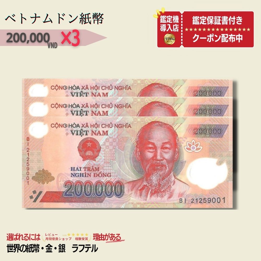 【優良ショップ受賞】3%OFF 20万ドン 3枚★即日発送・ピン札 保証・鑑定書 1,280円相当×購入枚数の特典付き|ベトナムドン紙幣|200,000ドン ベトナム20万ドン|本物紙幣保証【ラフテル公式】/B-6