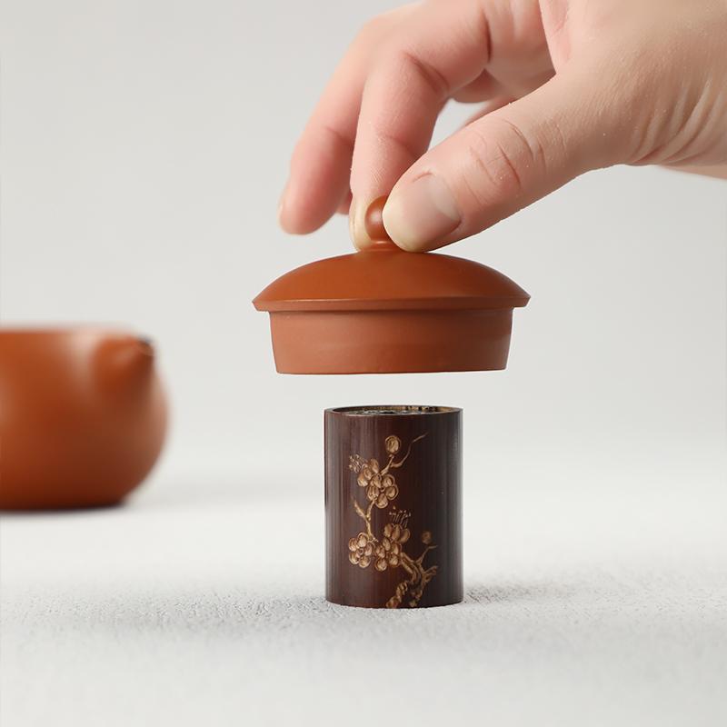 茶道具 蓋置 竹製 銅銭 モチーフ 小さめ 円筒 ホルダー スタンド 壺 台座 卓上 シンプル 彫刻 精巧 和風 レトロ 花柄 笹 蓮 おしゃれ ギフト