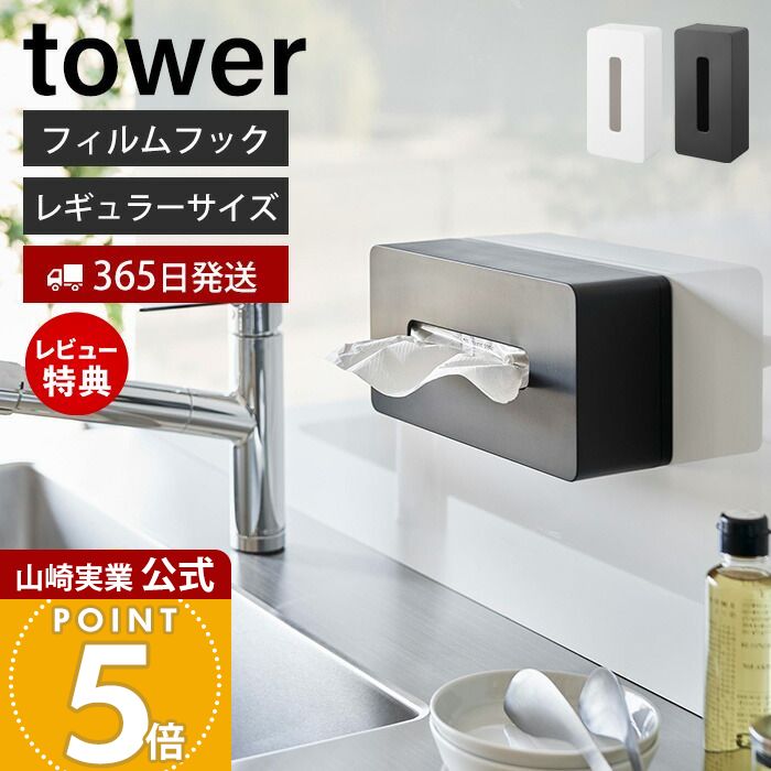 【11月1日最大ポイント10倍祭】ティッシュケース 壁掛け フィルムフックティッシュケース タワー レギュラーサイズ tower ティッシュカバー 浮かせる 白 黒 山崎実業 yamazaki ヤマジツ ポリ袋 壁面収納 おしゃれ シンプル タワーシリーズ キッチンペーパー 5587 5588