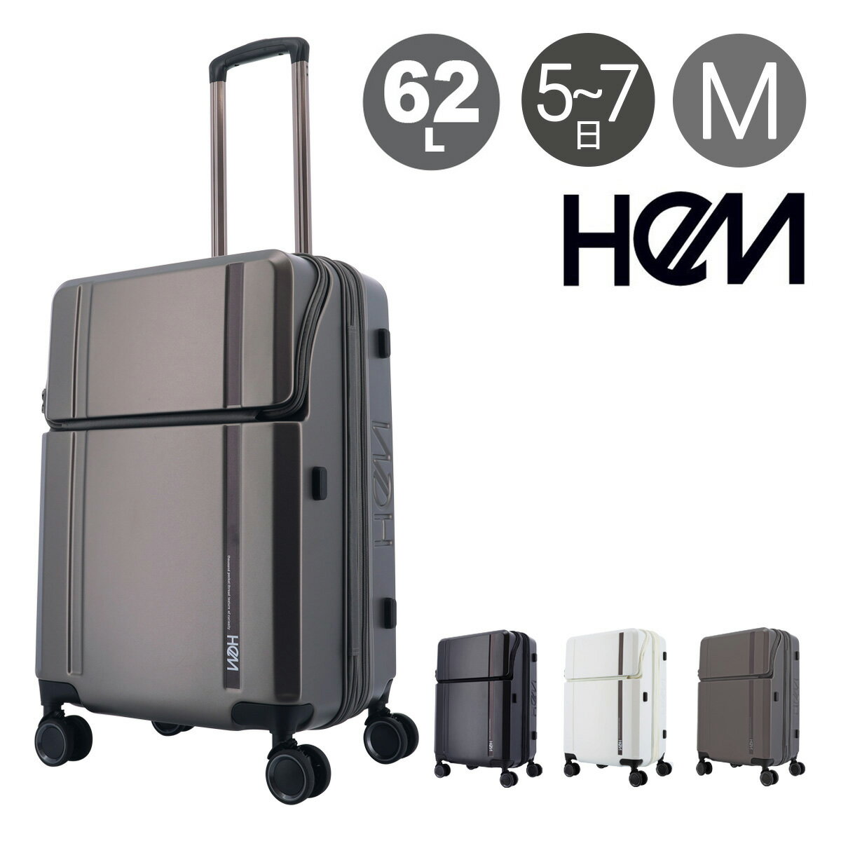 HeM ヘム スーツケース キャリーケース フロントオープン トップオープン マチ拡張機能 TSAロック Mサイズ 4輪 ダブルキャスター 64L メンズ レディース 男女兼用 39-507【とくとく2508】