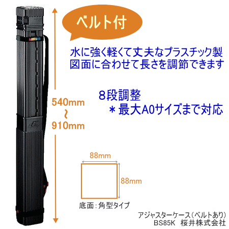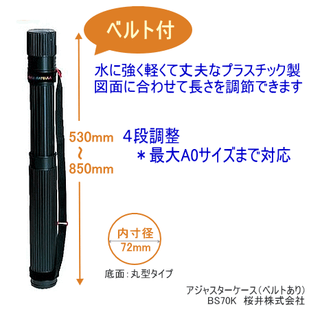 【楽天1位】図面ケース A1 A0対応 筒型 アジャスターケース プラスチック製 ベルト付 外出に便利 BS85K 桜井