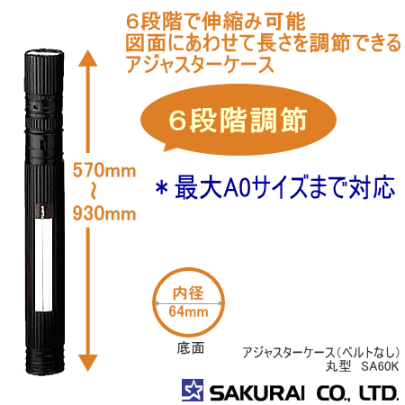 図面にあわせて長さを調節できる。6段階で伸縮自在の図面ケース 水に強く軽くて丈夫なプラスチック製。ポスターや図面の持ち運びや長期保存に最適。 商品名 アジャスターケース 丸型 ベルトなし 品番 SA60K ブラック サイズ 内寸径:64mm、長さ:570〜930mm 仕様 6段調整 ベルトなし 丸筒タイプ 材質 硬質ポリエチレン メーカー 桜井株式会社 ※他のモール及び店頭売りと在庫を併用しておりますのでご注文後でも在庫切れの場合がございますのであらかじめご了承下さい。 【関連商品】 図面ケース A1、A0対応 アジャスターケース 販売価格 2,205円 (税込) 図面ケース A1、A0対応 アジャスターケース 販売価格 2,940円 (税込) 図面ケース A1、A0対応 アジャスターケース 販売価格 2,205円 (税込) 図面ケース A1、A0対応 アジャスターケース 販売価格 2,940円 (税込) アジャスターケース ベルト 図面ケースバンド 販売価格 1,260円 (税込) ノックス カードサイズスタイル テンプレート 販売価格 483円 (税込) IDeo IDカードホルダー 吊り下げ名札 販売価格 1,512円 (税込) ぺんてる 多機能ペン ビクーニャEX 販売価格 1,050円 (税込) ペン立てになる筆箱 販売価格 1,050円 (税込)