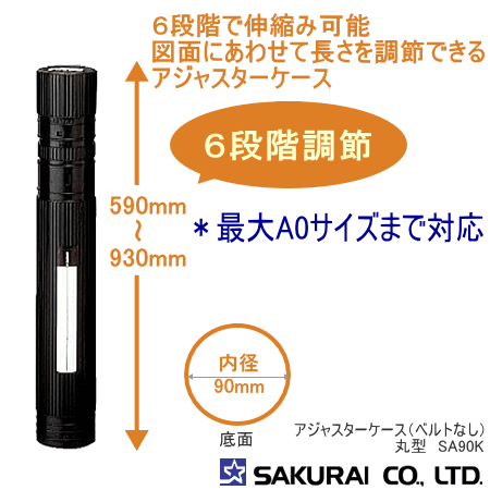 図面にあわせて長さを調節できる。6段階で伸縮自在の図面ケース 水に強く軽くて丈夫なプラスチック製。ポスターや図面の持ち運びや長期保存に最適。 商品名 アジャスターケース 丸型 ベルトなし 品番 SA90K ブラック サイズ 内寸径:90mm、長さ:590〜930mm 仕様 6段調整 ベルトなし 丸筒タイプ 材質 硬質ポリエチレン メーカー 桜井株式会社 ※他のモール及び店頭売りと在庫を併用しておりますのでご注文後でも在庫切れの場合がございますのであらかじめご了承下さい。 【関連商品】 図面ケース A1、A0対応 アジャスターケース 販売価格 2,205円 (税込) 図面ケース A1、A0対応 アジャスターケース 販売価格 2,940円 (税込) 図面ケース A1、A0対応 アジャスターケース 販売価格 2,205円 (税込) 図面ケース A1、A0対応 アジャスターケース 販売価格 2,940円 (税込) アジャスターケース ベルト 図面ケースバンド 販売価格 1,260円 (税込) ノックス カードサイズスタイル テンプレート 販売価格 483円 (税込) IDeo IDカードホルダー 吊り下げ名札 販売価格 1,512円 (税込) ぺんてる 多機能ペン ビクーニャEX 販売価格 1,050円 (税込) ペン立てになる筆箱 販売価格 1,050円 (税込)